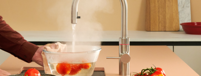 Das Einzige, was zu dem Kochendwasser-Hahn auf der Arbeitsplatte benötigt wird, ist ein Reservoir unter der Spüle, in dem das Wasser bei 108° C gespeichert wird. Das Reservoir wird an die Wasserleitung angeschlossen.